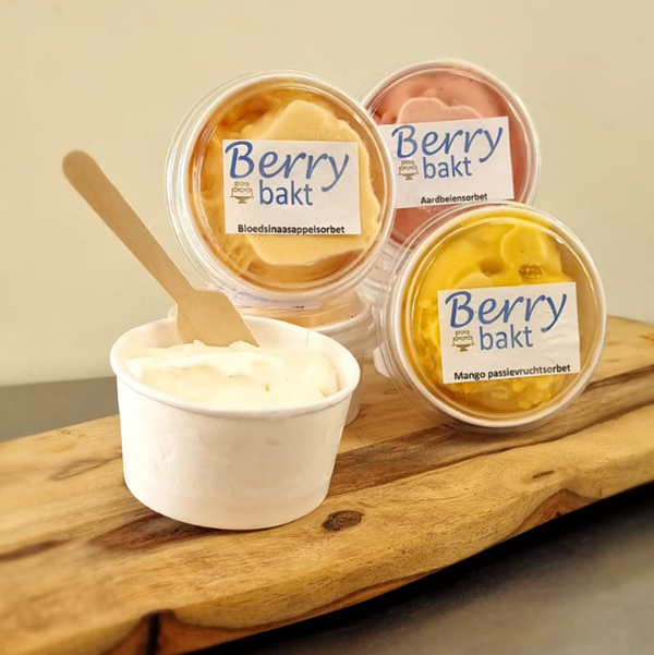 Keuze uit aardbei, vanille, chocolade, mango, citroensorbet, wilde bramensorbet, passiesorbet, bosvruchtensorbet
